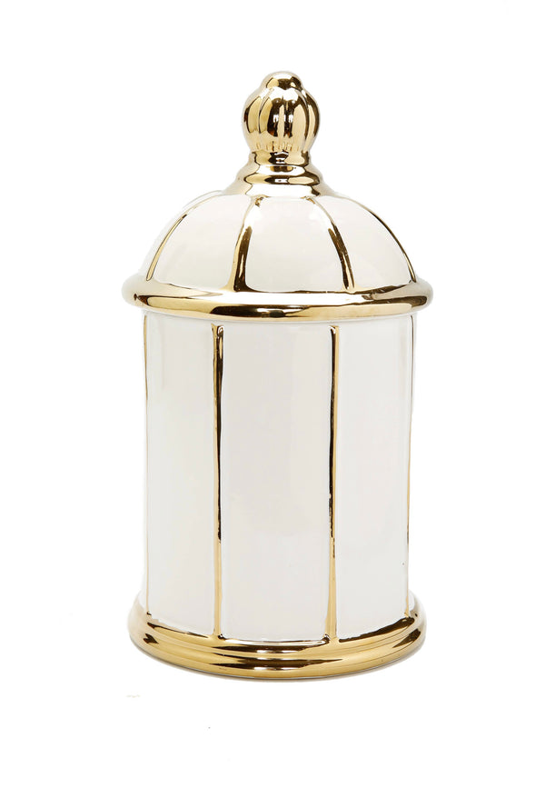 Hammered glass canister with gold ball design on bottom and top, white marble lid with gold knob. Measures: Small - 4"D x 8"H Med - 4"D x 10"H Large -...